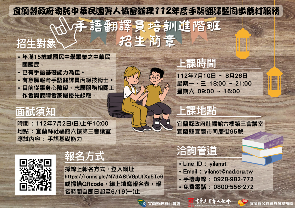 為培訓專業手語翻譯人才,宜蘭縣政府委託中華民國聾人協會辦理112年手語翻譯員培訓進階班,將於112年7月10日至8月26日,每週一三六開課,歡迎各界有志從事身心障礙或志願服務相關工作者踴躍報名,將聲音訊息轉化為手語呈現給需要服務的聽語障朋友,以達資訊無障礙之目的。